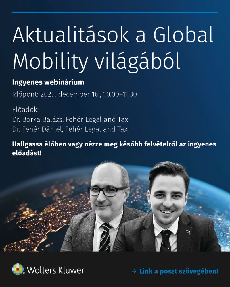 In Zusammenarbeit mit Wolters Kluwer Hungary Kft. hielten die Global Mobility Experten von Fehér Legal & Tax, Dr. Dániel Fehér und Dr. Balázs Borka, am 16. Dezember 2025 erneut ein Webinar zum Thema globale Mobilität ab, das folgende Themen behandelte: